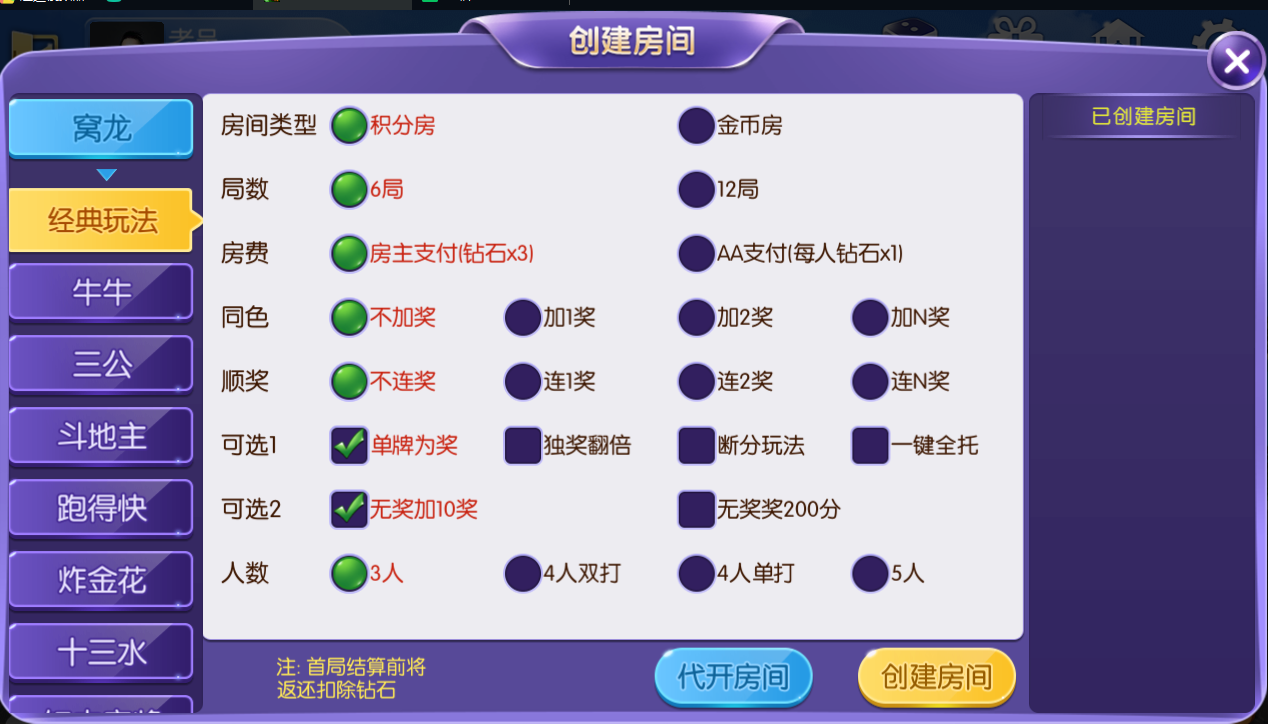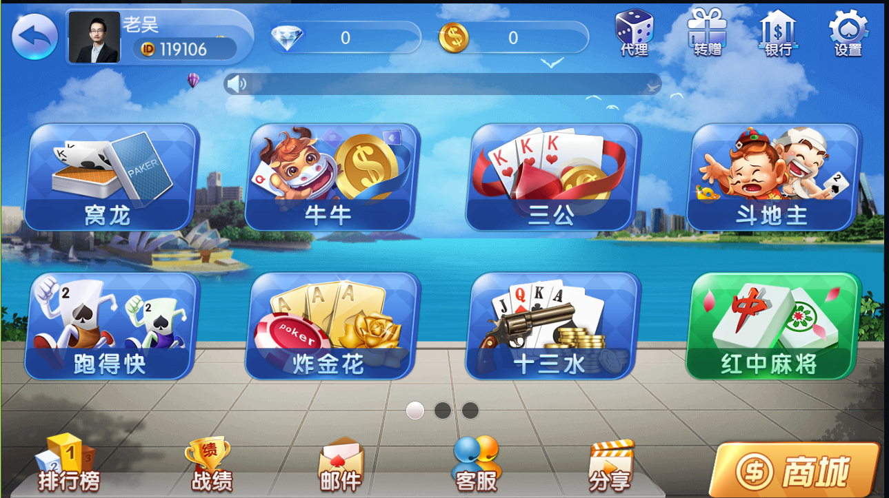 本套所含子游戏:牛牛、斗地主、炸金花、红中麻将、三公、跑得快、十三水、跑胡子、10点半、21点、血战麻将、牌九、卧龙、广东推倒胡。部份游戏中存在多种玩法(大众性的)本次增加了上饶窝龙非卧龙。