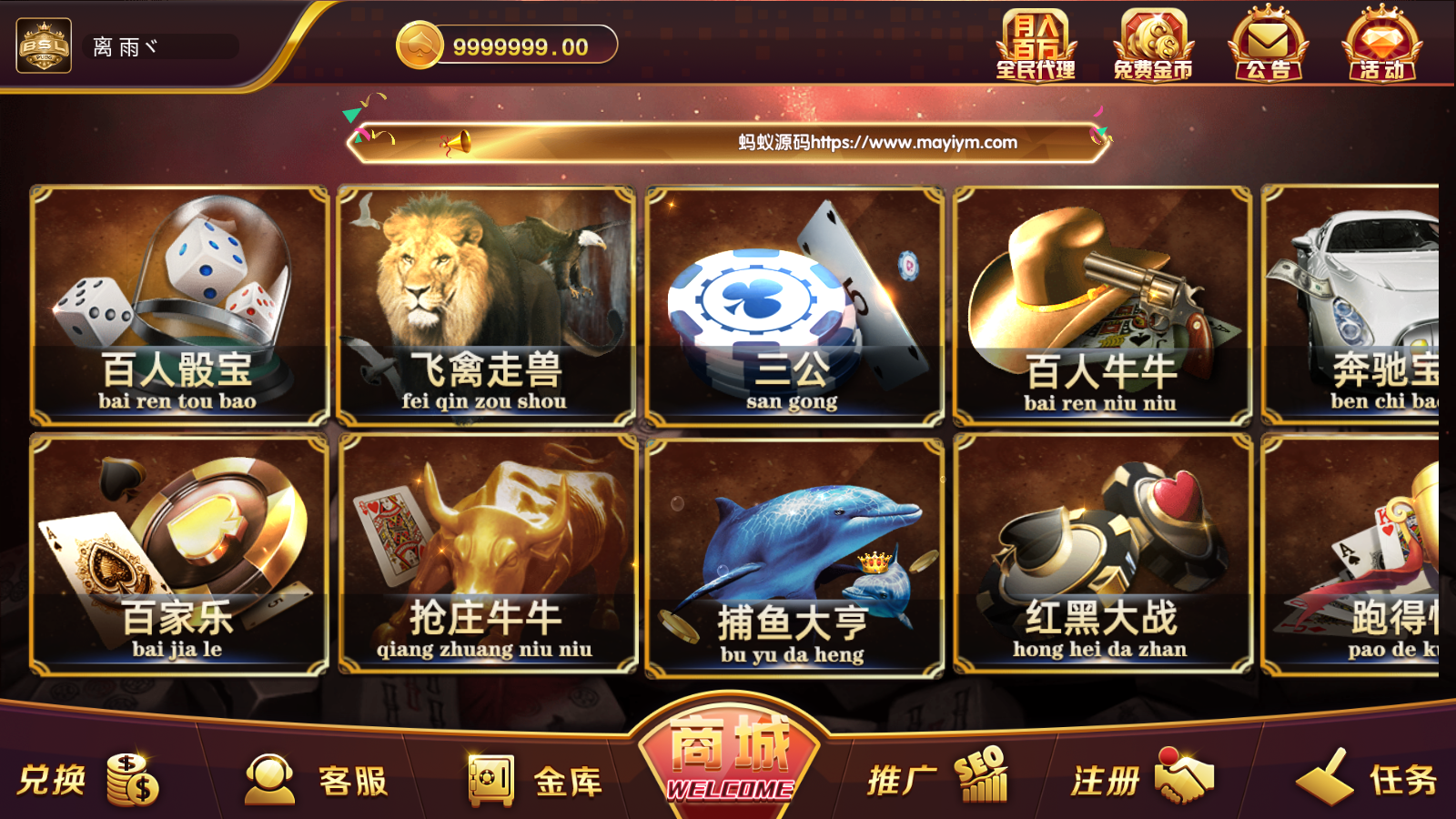 内含游戏:红包扫雷、斗地主、轮盘、炸金花、分分、财神到、水果机、龙虎斗、百人骰宝、飞禽走兽、三公、百人牛牛、奔驰宝马、十三水、百家乐、抢庄牛牛、捕鱼大亨、红黑大站、跑得快、二八杠