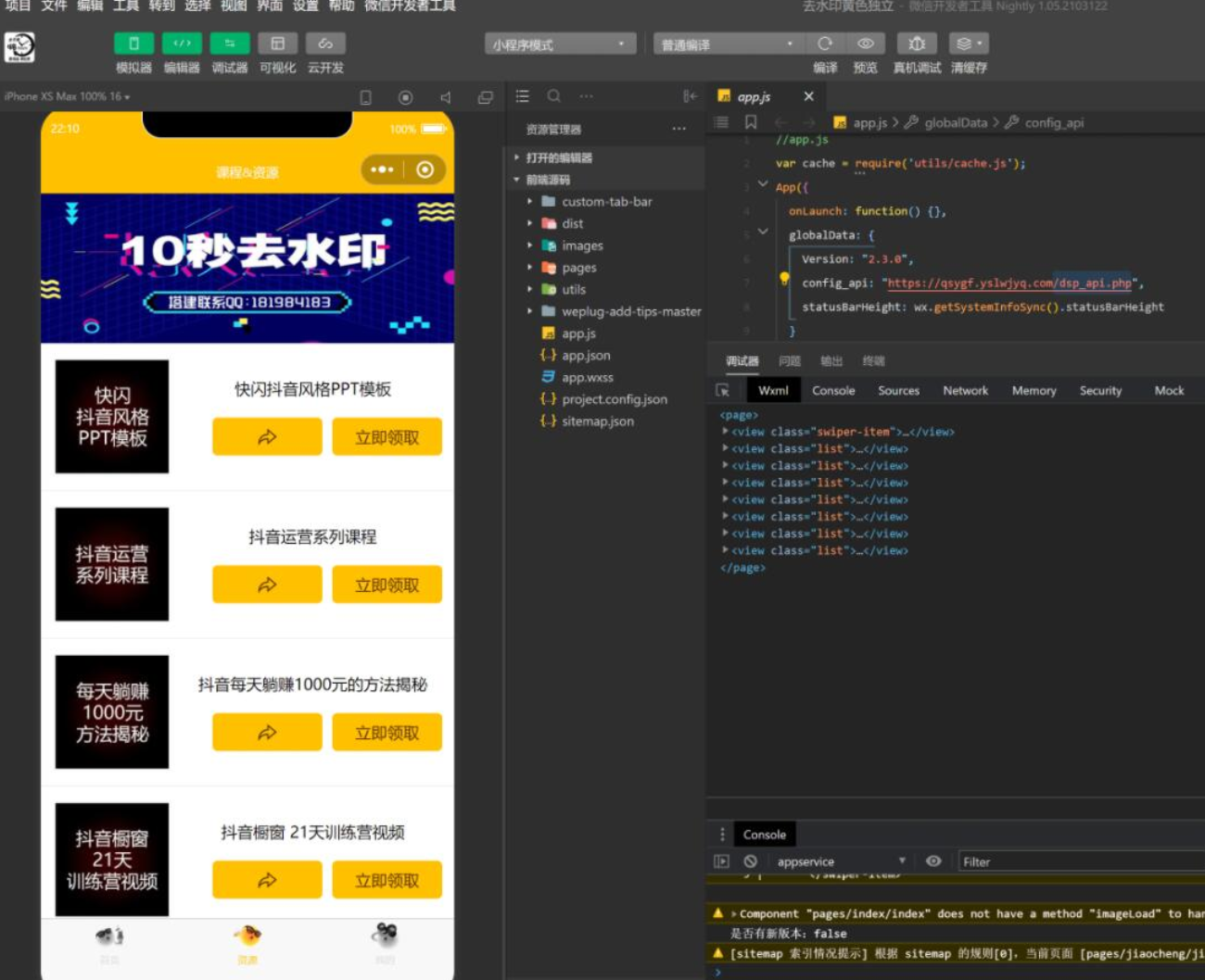 详情介绍 热水印小程序的源代码,无论是微信还是QQ小程序都可以使用! 资源下载下载价格20 积分VIP免费升级VIP立即购买此资源购买后1天内可下载。虚拟资源具有可复制性,购买后不支持任何理由退款,请谨慎下单! 请勿商业运营,违法使用和传播!仅供研究学习使用! 原文链接:https://lw.7b1.cn/3585.html,转载请注明出处。 0