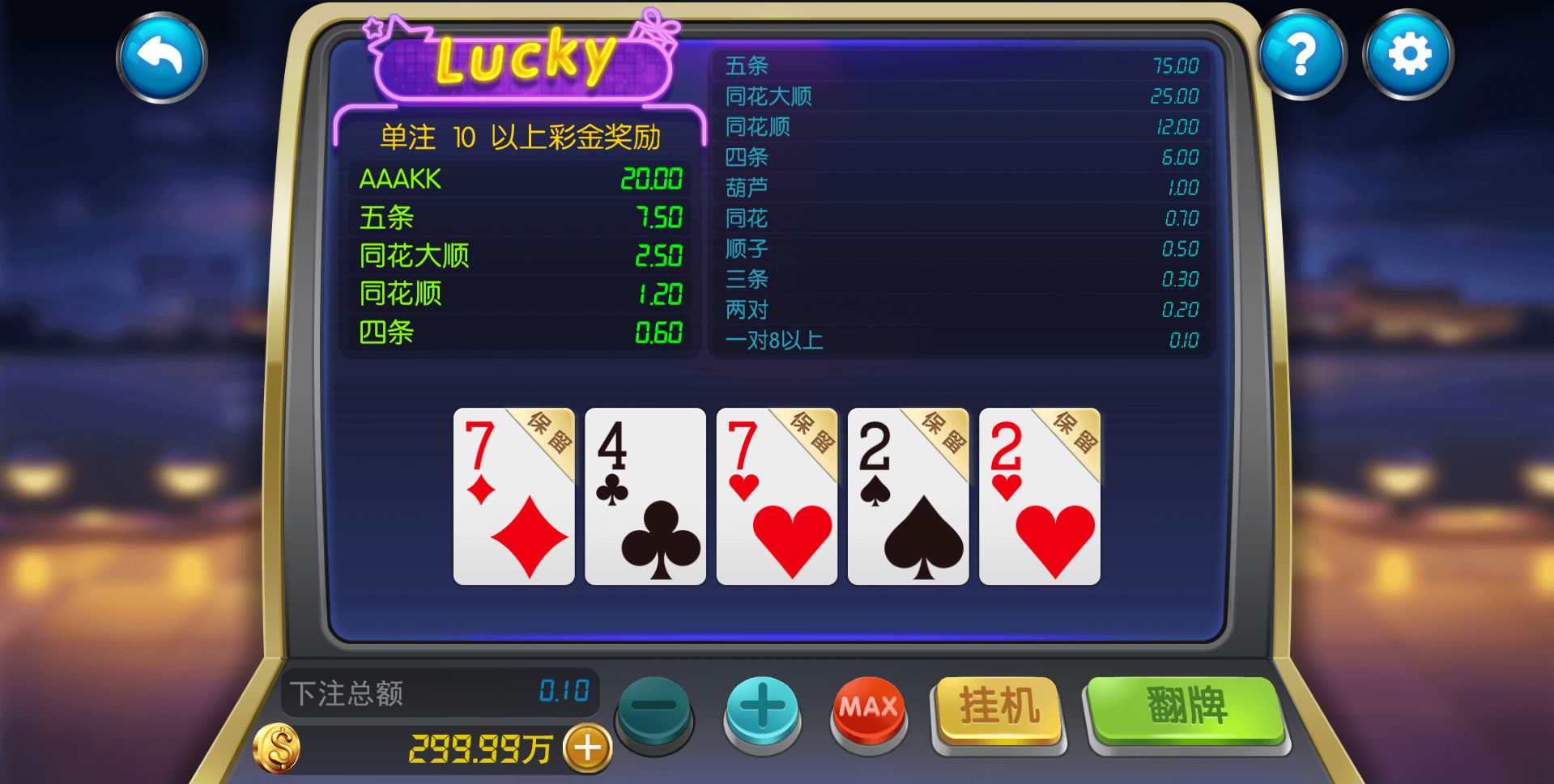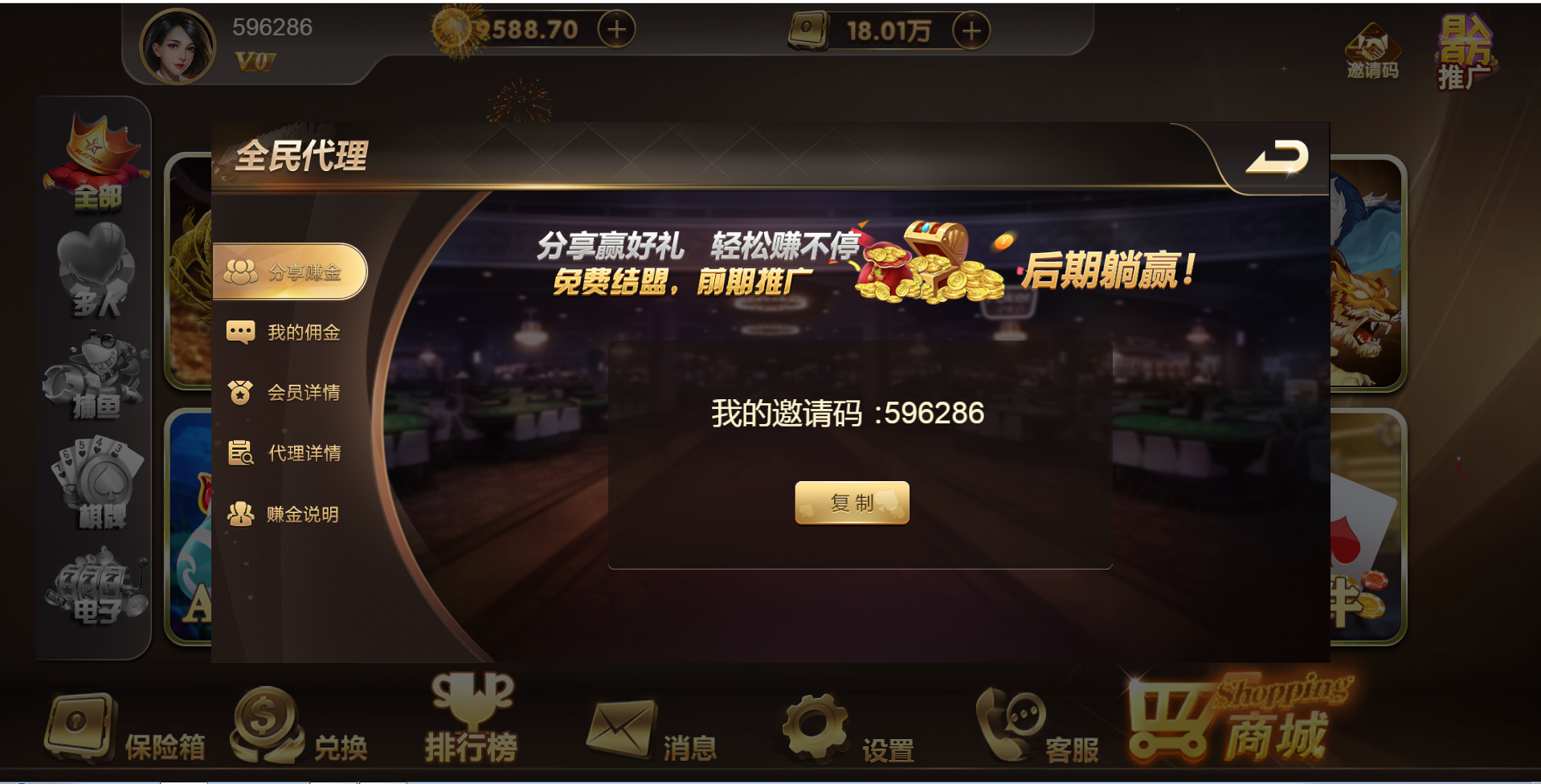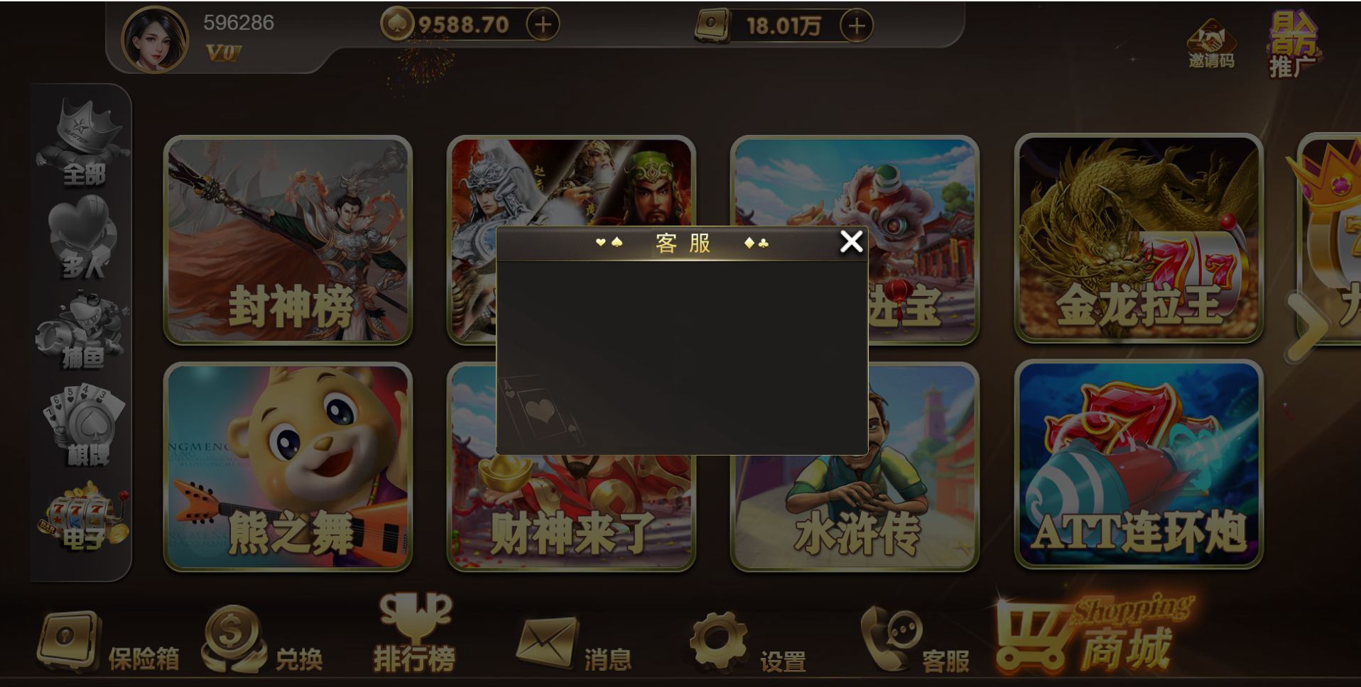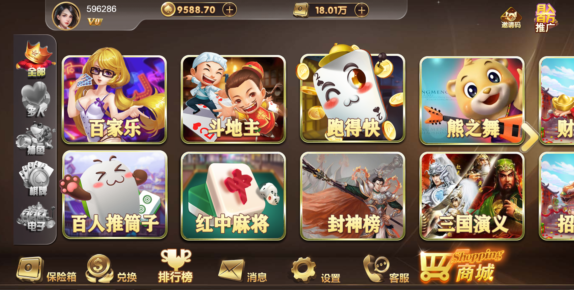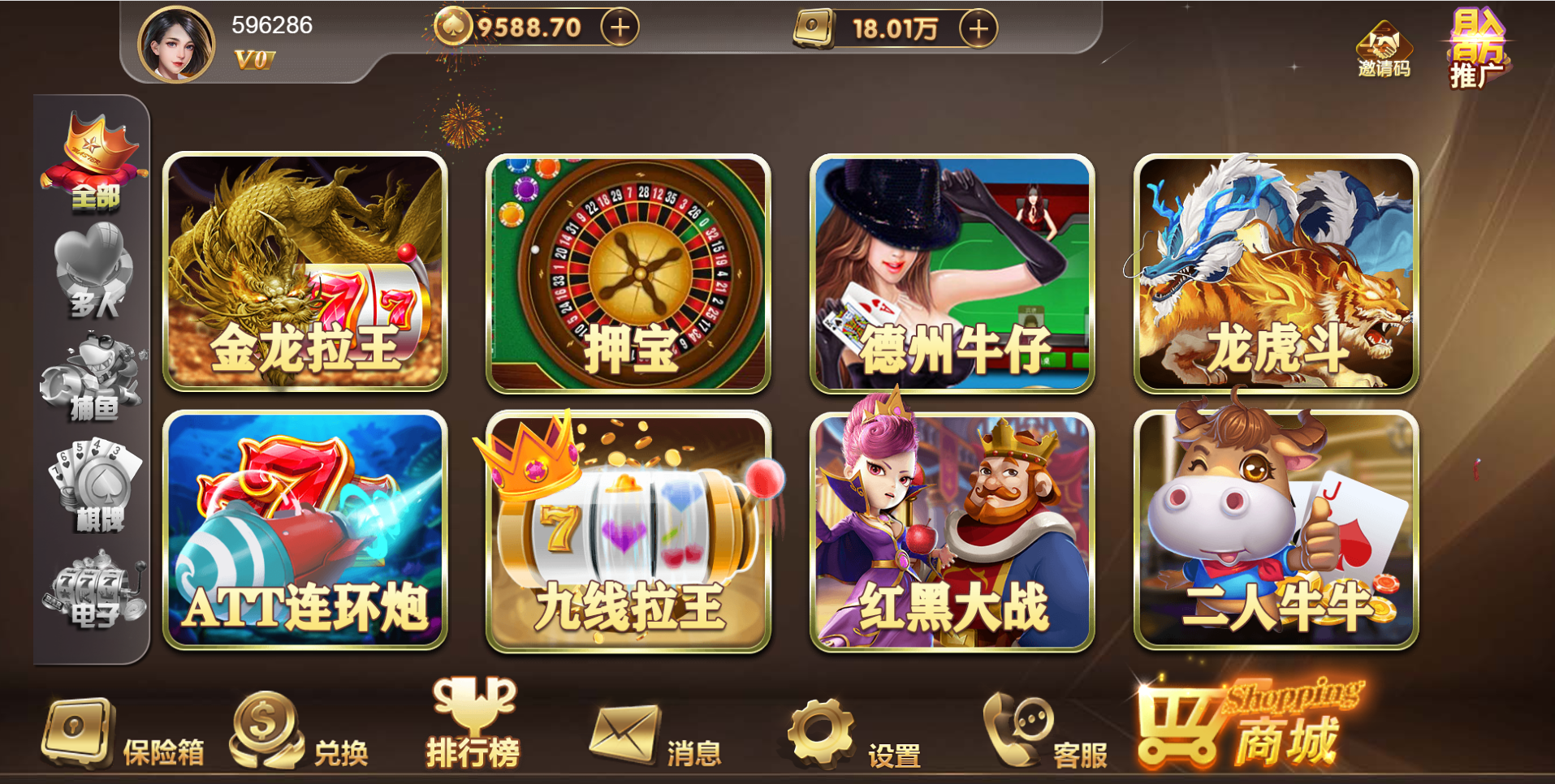 游戏种类:德州扑克 扎金花 十三水 抢庄牛牛 百人扎金花 奔驰宝马 百人牛牛 骰宝 百家乐 百人推筒子 斗地主 红中麻将 跑得快 封神榜 熊之舞