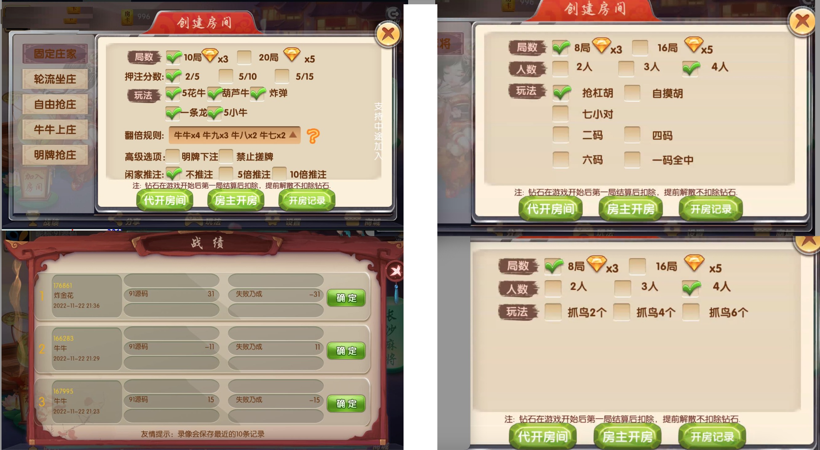 详情介绍 包含游戏:牛牛、炸金花、红中麻将、长沙麻将、转转麻将、跑得快 资源下载下载价格100 积分VIP免费升级VIP立即购买此资源购买后1天内可下载。虚拟资源具有可复制性,购买后不支持任何理由退款,请谨慎下单! 请勿商业运营,违法使用和传播!仅供研究学习使用! 原文链接:https://lw.7b1.cn/924.html,转载请注明出处。 0